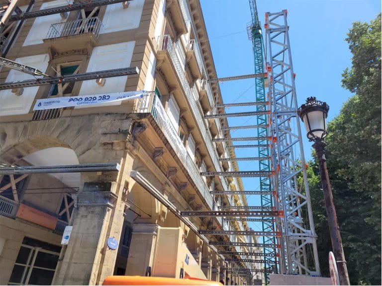 Para que los contrapesos pudiesen salvar la acera, nuestro Dpto. de Ingeniería diseñó una estructura con torres Granshor, separadas de la fachada y unidas a ella mediante puntales Superslim.