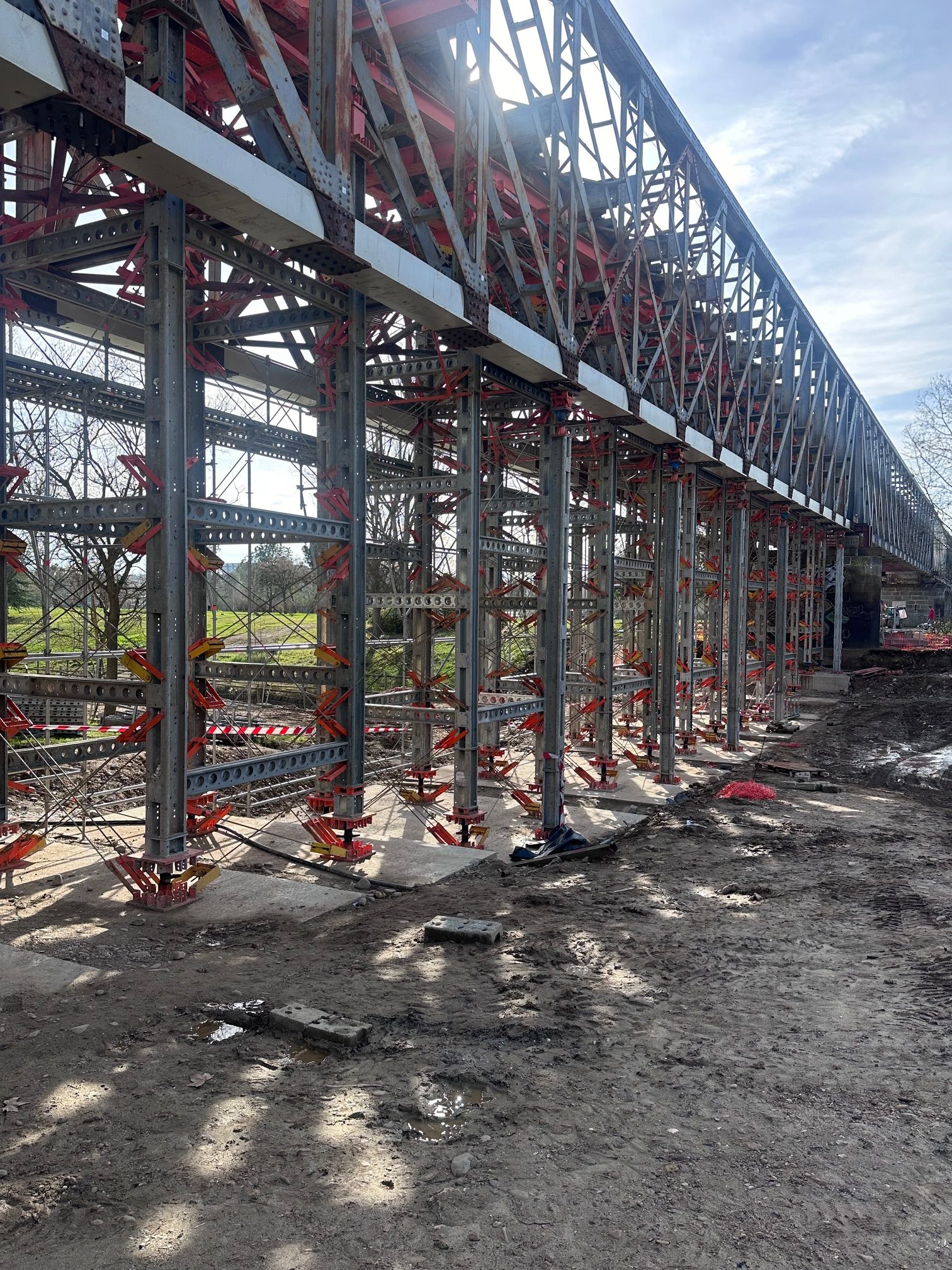 Nuestro trabajo ha consistido en el diseño e instalación del sistema de apeo de altas cargas que ha permitido el izado controlado del tablero del puente mediante más de 30 gatos hidráulicos sincronizados, con el objeto de recuperar la deformación en alzado detectada en los vanos 2 y 4 del viaducto.