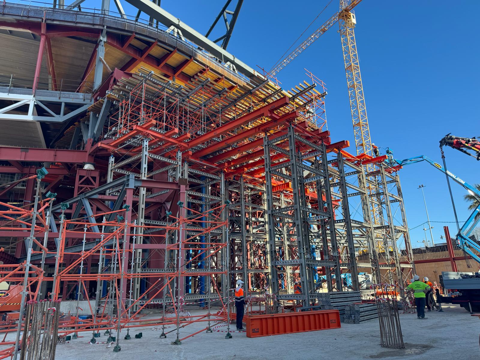 - Flujos de obra sin interrupciones: se mantuvieron pasillos y áreas de servicio despejadas para equipos y personal, minimizando interferencias con la celosía tridimensional de la estructura definitiva.