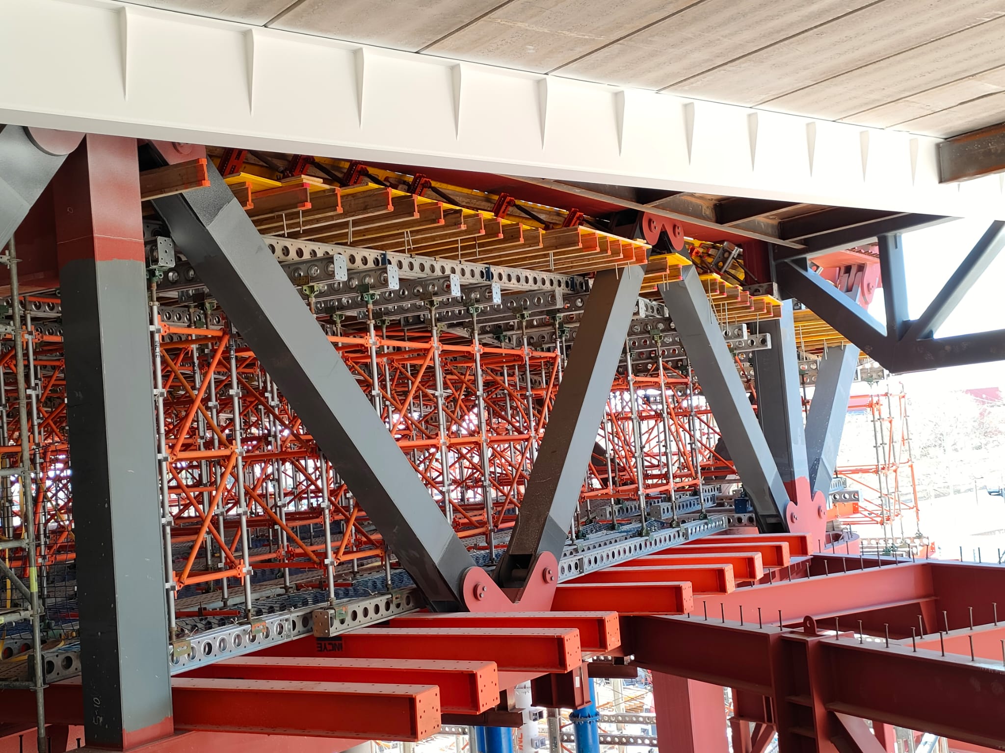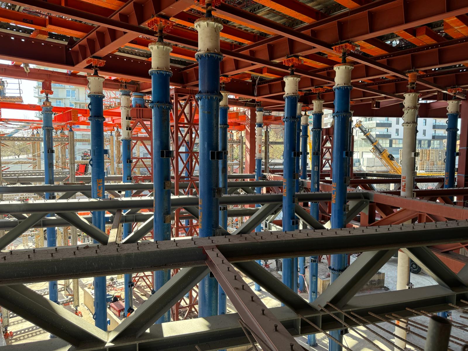 - Transferencia de cargas y plataforma de trabajo: disposición de perfiles de gran canto entre torres y el forjado metálico inferior a la futura losa, creando una plataforma sobre la que montar un sistema de correas Superslim y levantar cimbra Kwikstage hasta la cota de encofrado, ocupando solo el volumen estrictamente necesario.